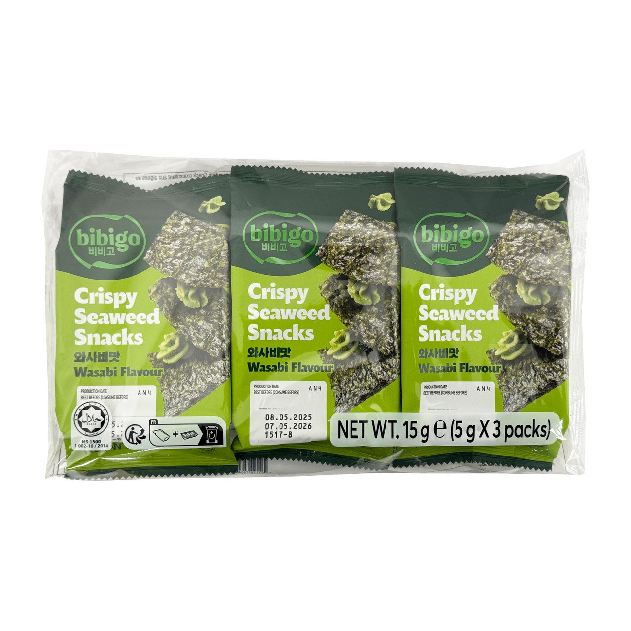 Nori Bibigo su wasabi (3 × 5 g) – tai korėjietiški traškūs jūros dumblių lapeliai, pagardinti intensyvaus skonio wasabi prieskoniu. Lengvai kepti ir subtiliai sūdyti, jie išsiskiria ryškiu skoniu ir maloniu traškumu.